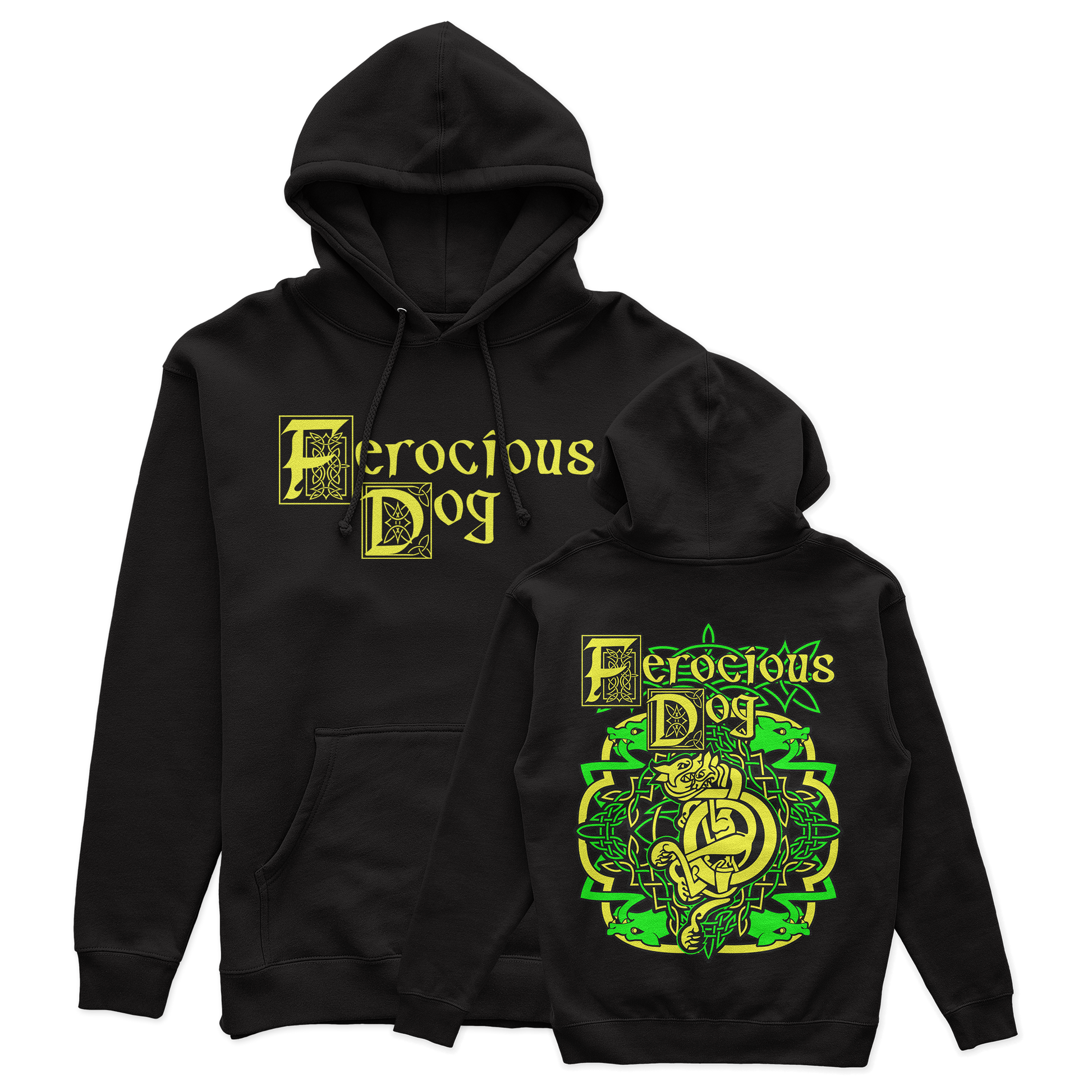 Inspired by the roots of Ferocious Dog, the Celtic Throwback Unisex Pullover Hoodie combines elements of the original band logo with the iconic Cry of the Celt design. Featuring bold Yellow and Green Celtic knotwork surrounding a fierce hound, this tee makes a powerful statement of heritage and rebellion.