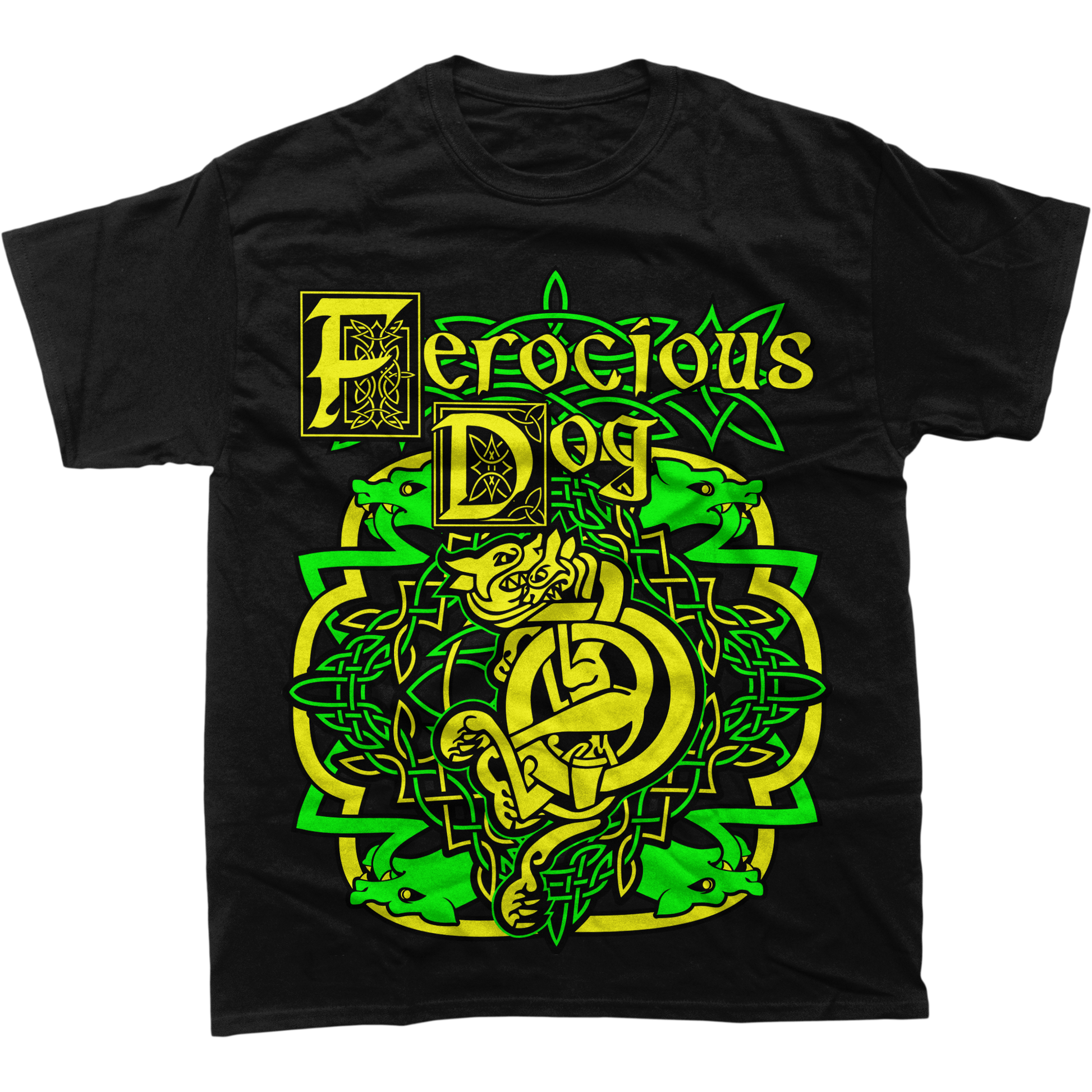 Inspired by the roots of Ferocious Dog, the Celtic Throwback Unisex T-Shirt combines elements of the original band logo with the iconic Cry of the Celt design. Featuring bold green and yellow Celtic knotwork surrounding a fierce hound, this tee makes a powerful statement of heritage and rebellion.