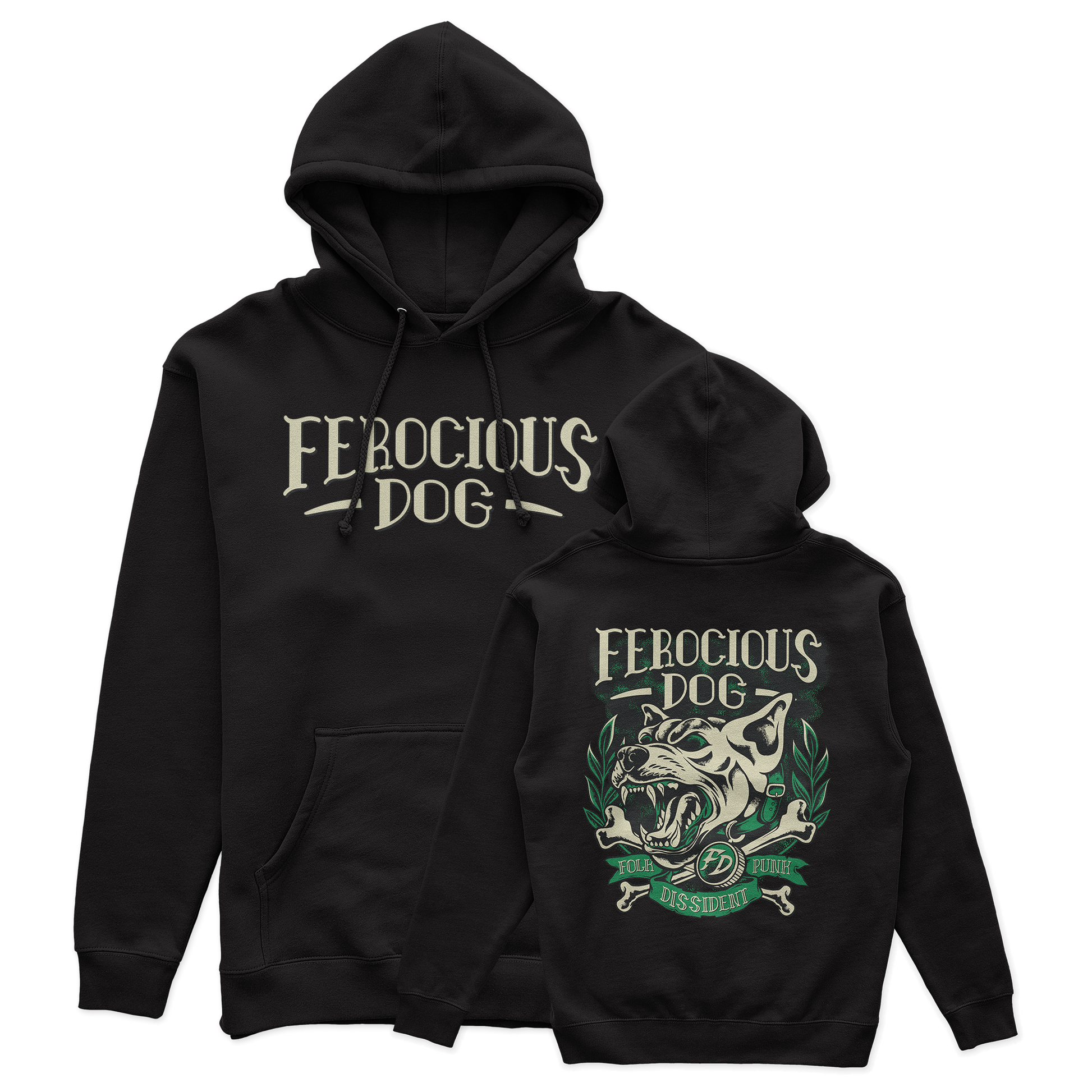 Unleash your rebellious spirit with the Folk • Punk • Dissident pullover hoodie! This bold and striking design features a ferocious, snarling hound, surrounded by laurel leaves, crossbones, and powerful typography, embodying the true essence of folk-punk dissidence.