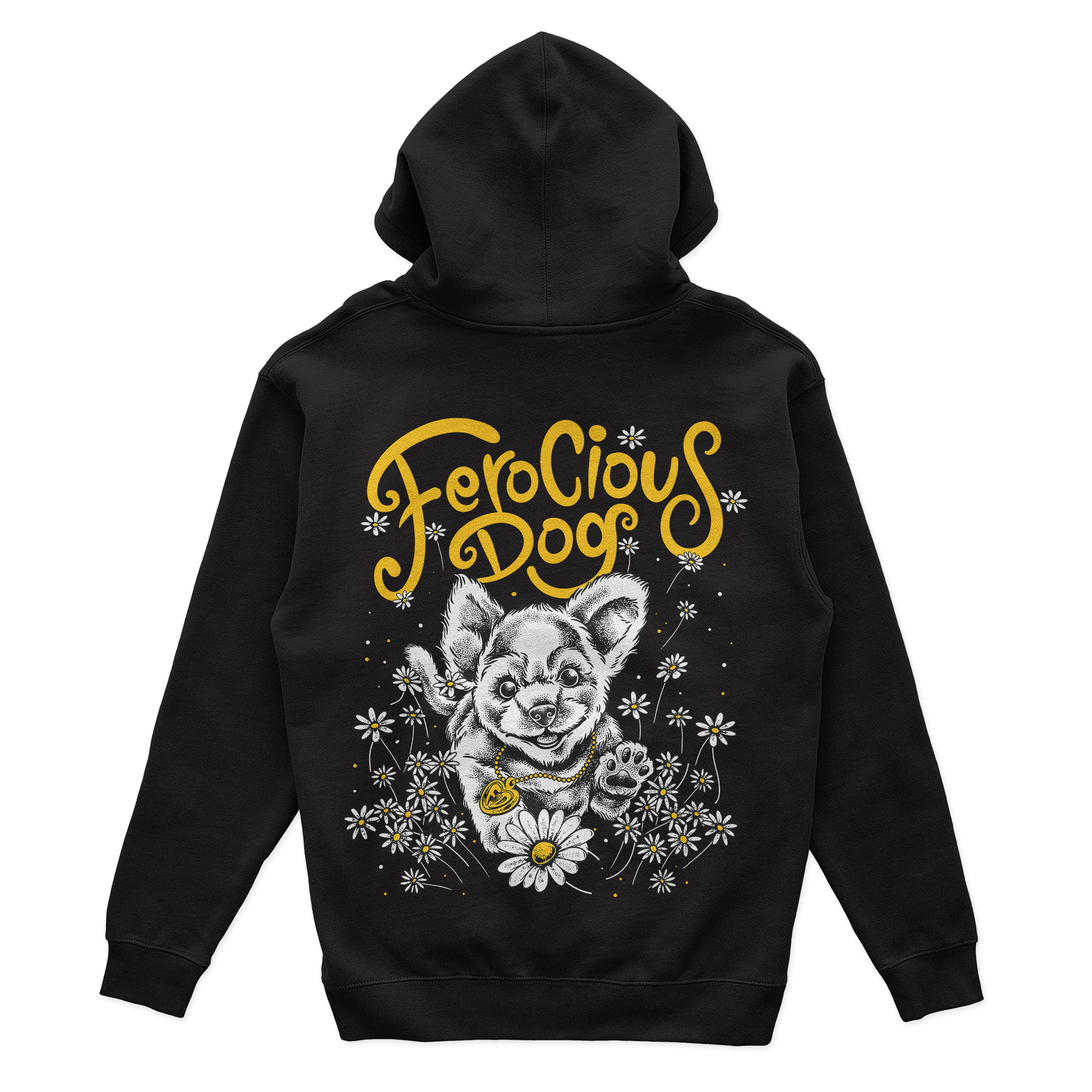 The Running Pup - Ladies Pullover Hoodie is the perfect blend of punk attitude and playful charm. Featuring an energetic pup dashing through a field of daisies, this design is bold, bright, and full of life – just like Ferocious Dog fans!